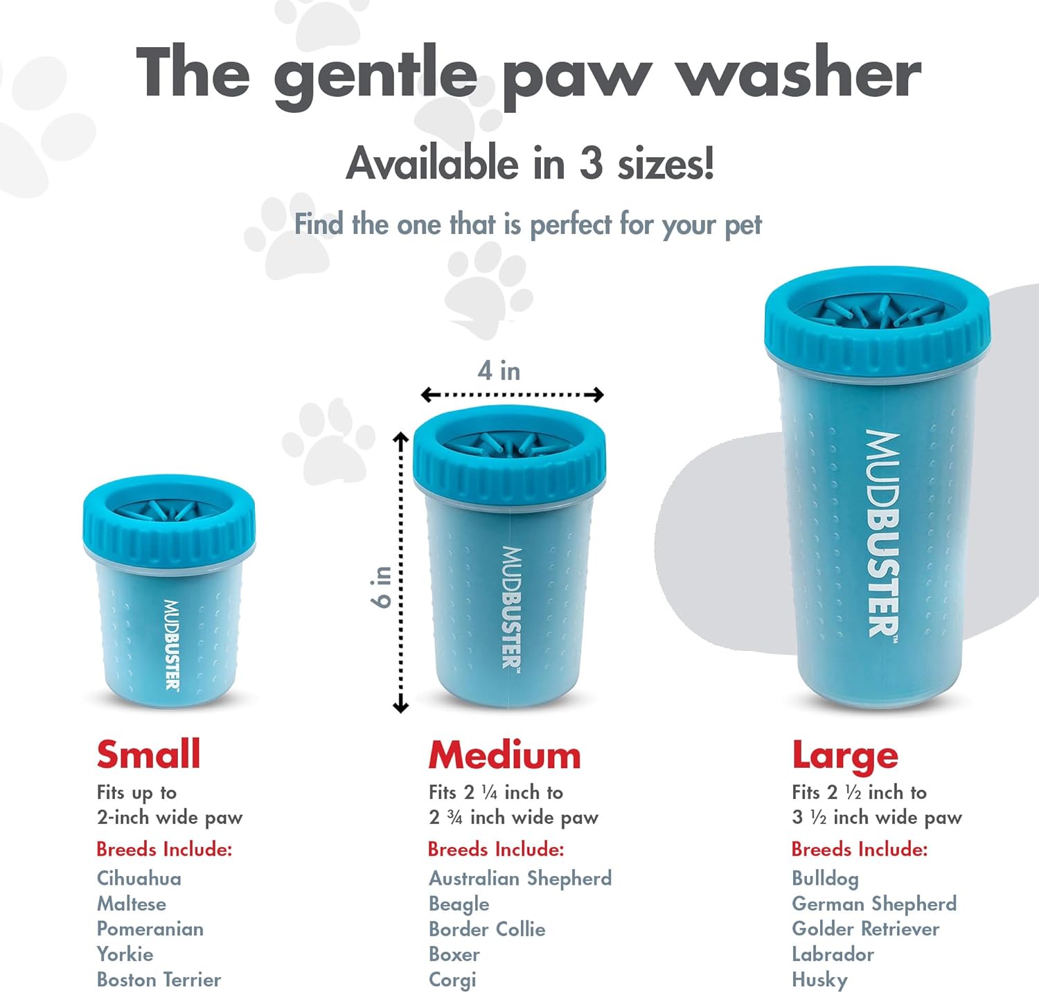 Easy to Use: Simply add water, insert the muddy paw, twist, dab dry, and repeat for all four paws. Mess-Free Cleaning: Gentle silicone bristles help remove dirt and mud from your dog’s paws, keeping the mess in the MudBuster and not in your home.Dog Essential: Keep the MudBuster handy after trips to the park, walks, or hikes. An essential dog product for every household. Portable & Travel-Friendly: Lightweight and. compact, the MudBuster is easy to bring along on walks, hikes, or road trips, ensuring your dog’s paws stay clean wherever you go. Keep your car and home free from mud and dirt, no matter the adventure!