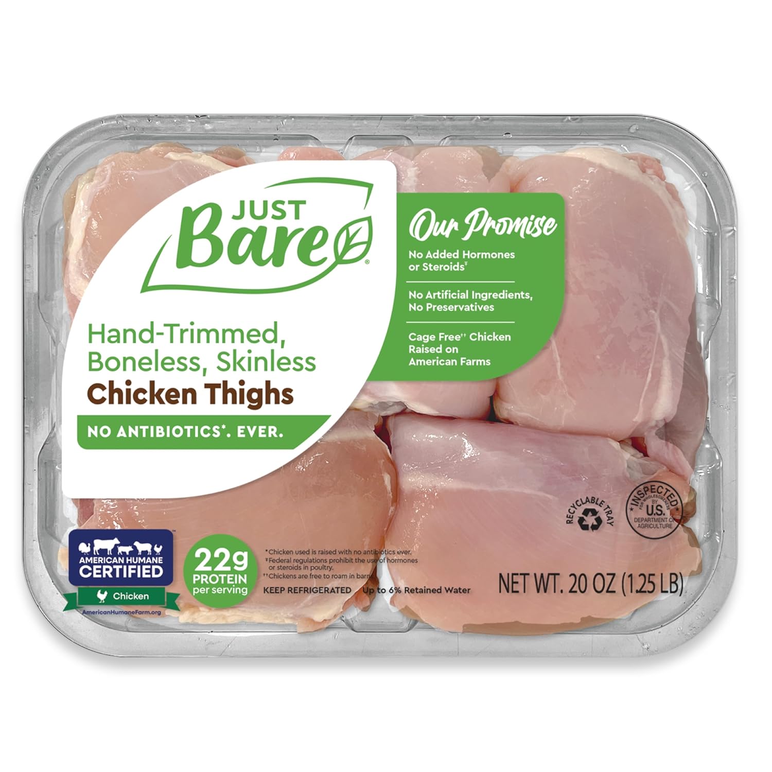 Our boneless, skinless chicken thighs make prepping dinner a breeze. They are a delicious protein source and are easy to prepare. Add them to a marinade, or top with your favorite sauce. These are sure to be a hit! As always, Just Bare® provides chicken that features no antibiotics, ever*. Has no added hormones or steroids†. Uses no artificial ingredients or preservatives and uses chickens raised cage free on American farms.